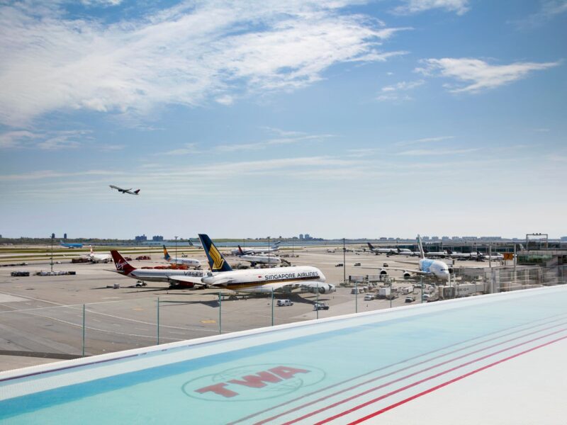 Y eso no es todo: desde la Infinity Pool en la azotea del TWA Hotel, una piscina infinita de casi 20 metros de largo, los huéspedes pueden disfrutar de una vista impresionante de las pistas más concurridas de uno de los aeropuertos más famosos del mundo.
