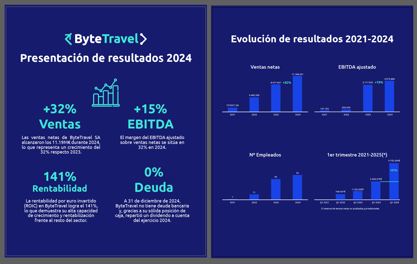 ByteTravel (SCBYT) ha anunciado sus resultados para 2024, destacándose con un crecimiento orgánico sostenido y una notable rentabilidad. La compañía, que se especializa en servicios auxiliares para viajeros de turismo y negocios, ha alcanzado un incremento del 32% en sus ventas y un retorno sobre el capital invertido (ROIC) del 141%. Además, ha experimentado una revalorización bursátil del 567% tras su salida al mercado BME Scaleup en julio de 2024.