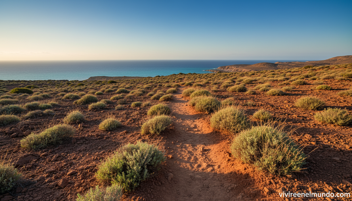 El origen volcánico del terreno explica el color peculiar del suelo —rojo, ocre, negro— y la vegetación semiárida que cubre las laderas: esparto, pita, palmito. Es el único desierto de Europa, y es hermoso precisamente porque no se parece a nada conocido. Caminar aquí es caminar en otro continente sin salir de España.