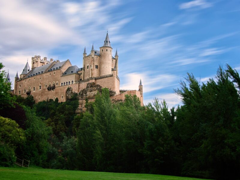 El Alcázar es uno de los castillos más famosos de España. Está construido sobre un gran peñasco rocoso sobre la confluencia de los ríos Eresma y Clamores, en Segovia. Originalmente fue levantado como un fuerte árabe, pero ha servido como palacio real, un Colegio Real de Artillería y una academia militar desde entonces. Durante la Edad Media fue una de las residencias favoritas de los reyes de Castilla y una fortaleza clave para la defensa del reino. Fue durante este periodo cuando se construyó la mayor parte del edificio actual.